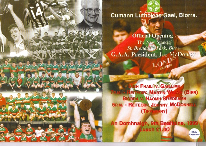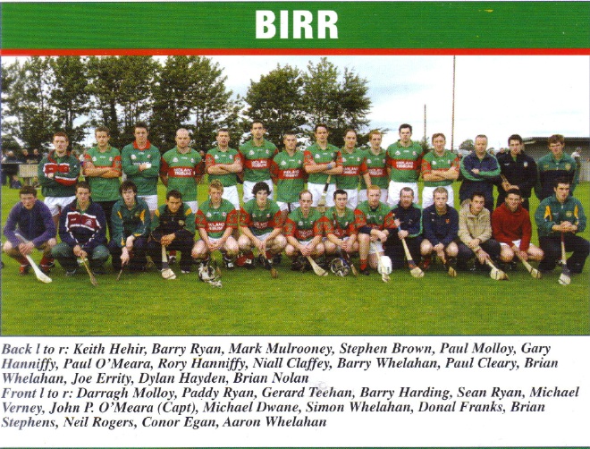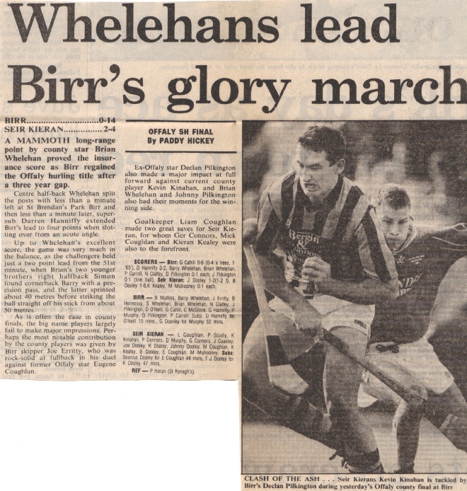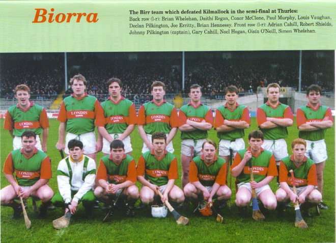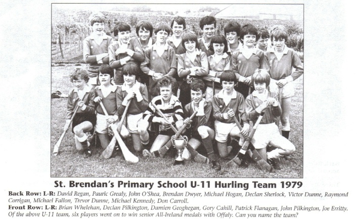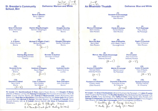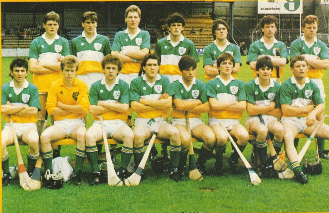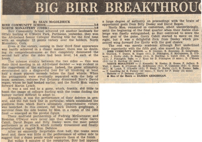 Eleven players of the first fifteen were from Birr, plus another four Birr players were in the subs. Out of the Birr Community School team that won the All Ireland Senior Colleges Hurling Final on the 27th April 1986, 11 of the first team and 4 of the subs were from Birr. They were, with player number in brackets – Brian Hennessy (2), Damien Geoghgan (3), Declan Sherlock (4), Victor Dunne (5), Michael Hogan (6), Declan Pilkington (7), Brendan O’Dwyer (9), Joe Errity (10), David Regan (11), Gary Cahill (13), and John Pilkington (15). Subs: Justin Ryan (16) , Trevor Dunne (19), Adrian Cahill (25) and Brian Whelahan (26).